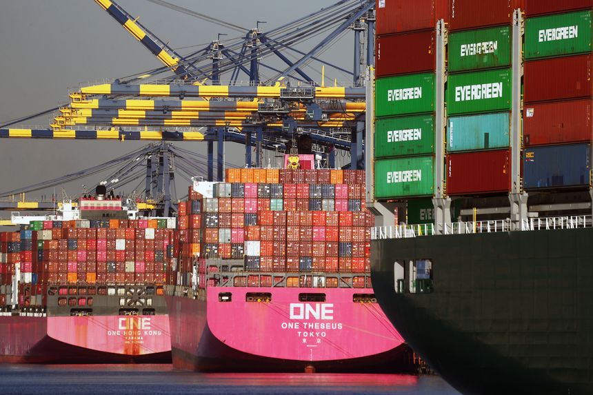 Shipping containers and trucks inside the Port of Los Angeles. Record backups of container ships in the U.S. among other factors suggest big volumes of goods are still tied up in supply chains.